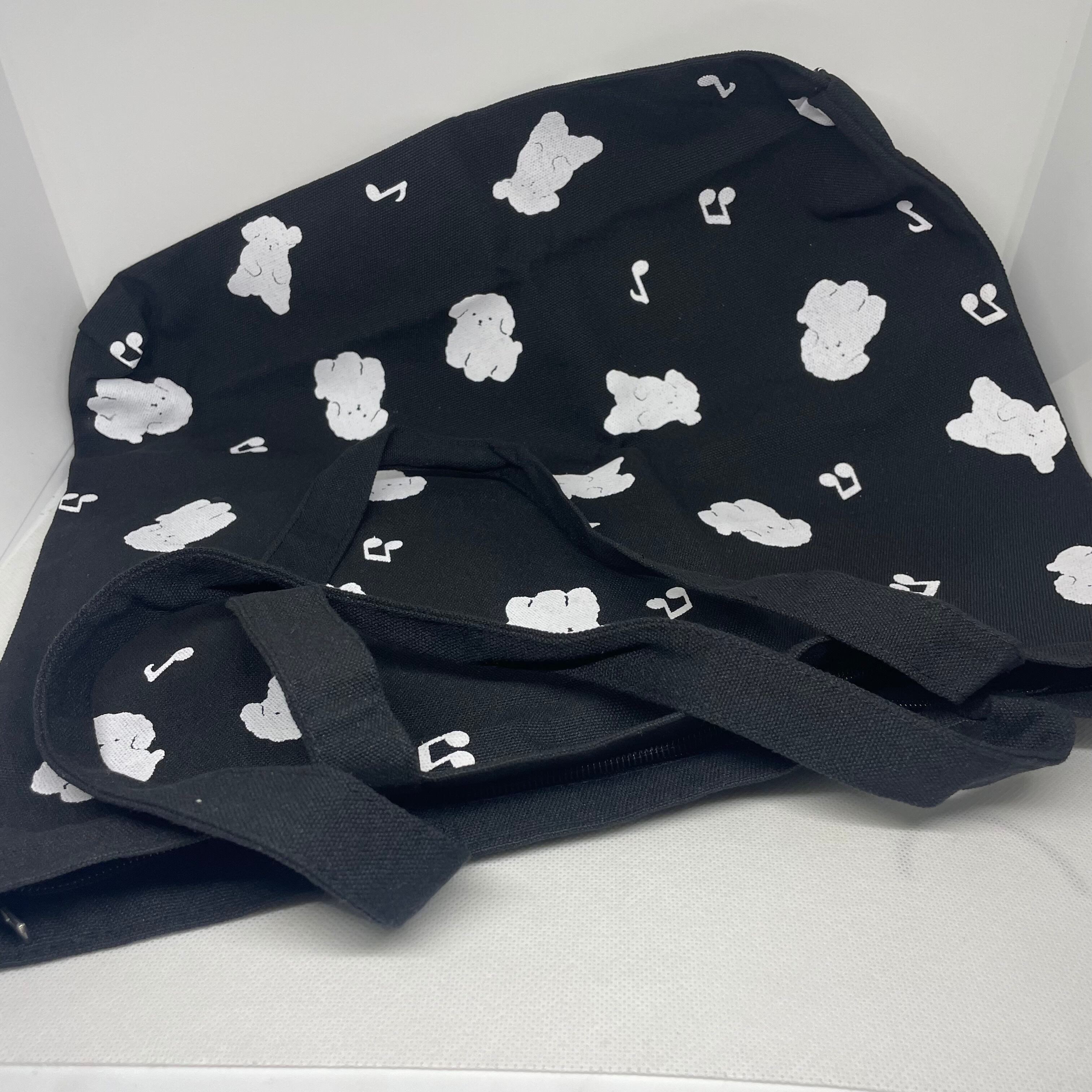 黒地に映える、愛らしいわんちゃん柄と音符が散りばめられたトートバッグ。