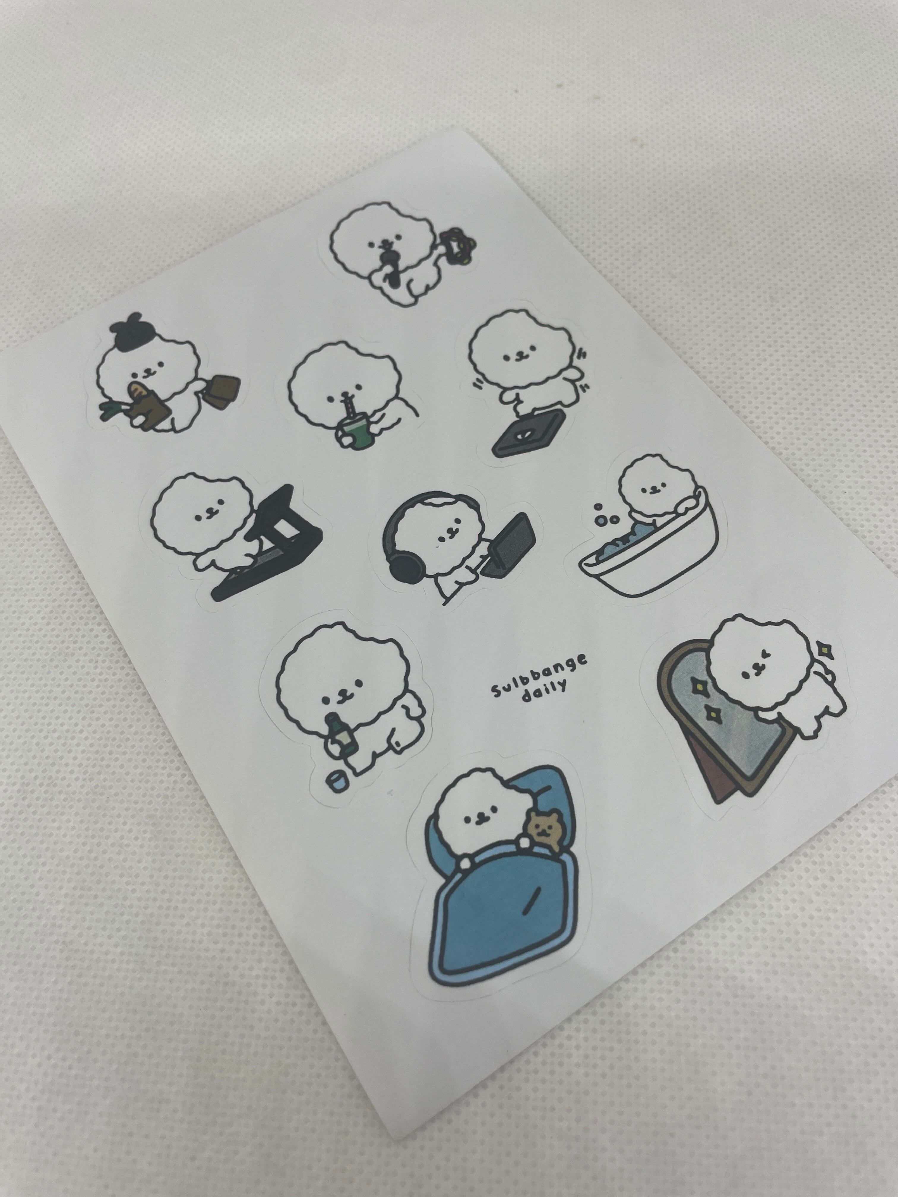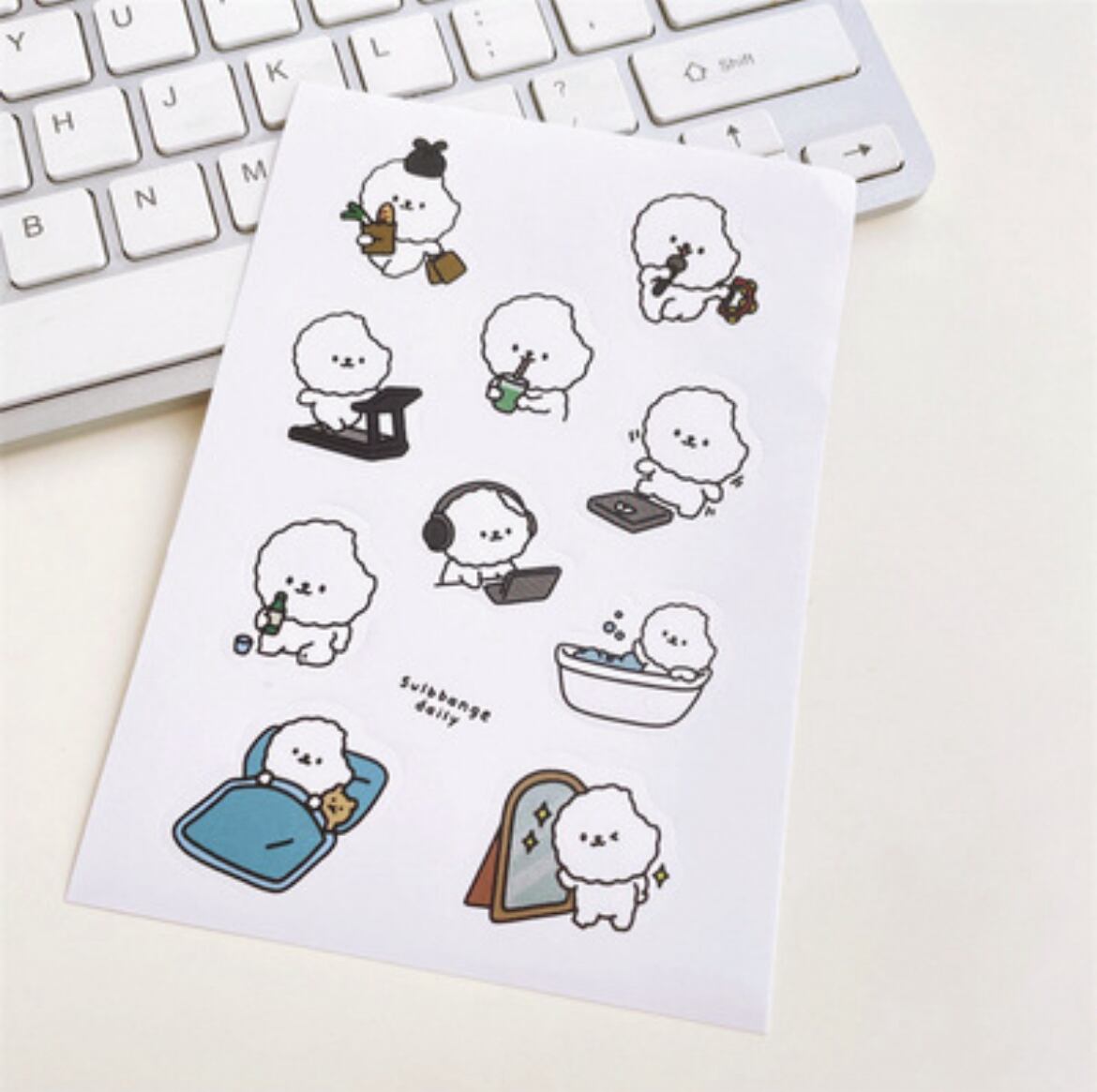 ビションフリーゼの日常を描いた、可愛らしいステッカーです。