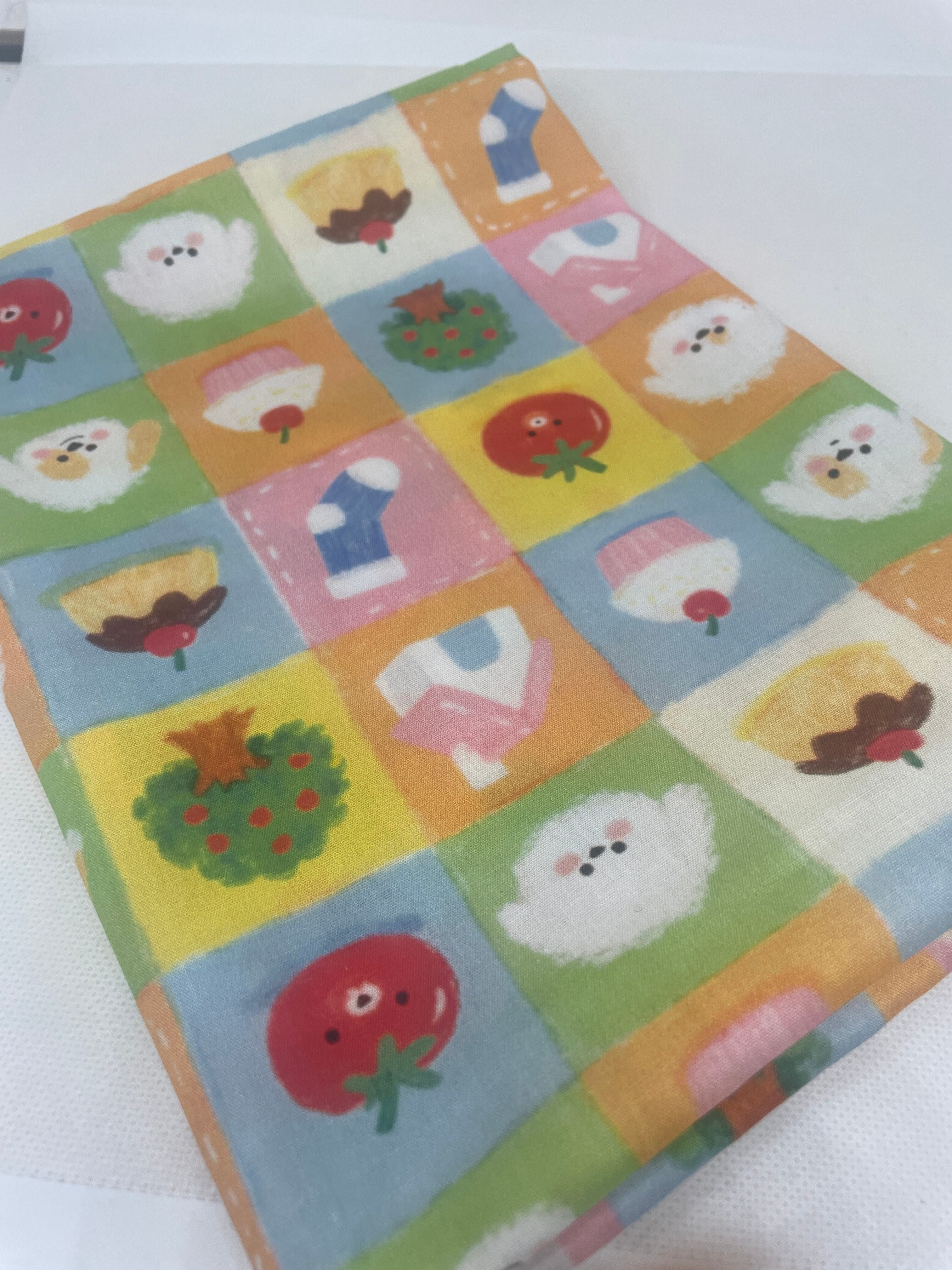 【柄】わんちゃん、プリン、カップケーキ、トマト、靴下、おうち、木 などの総柄デザイン