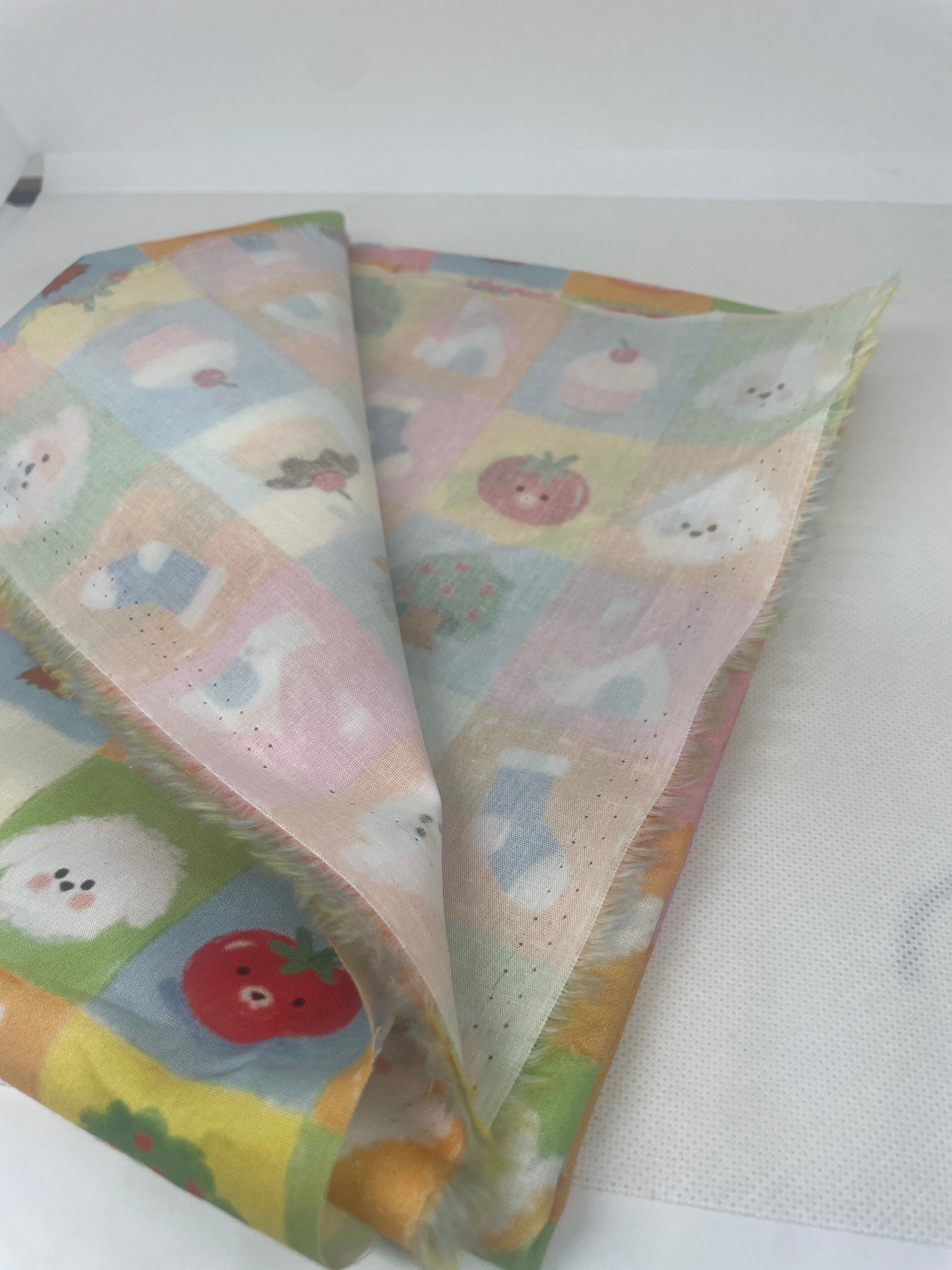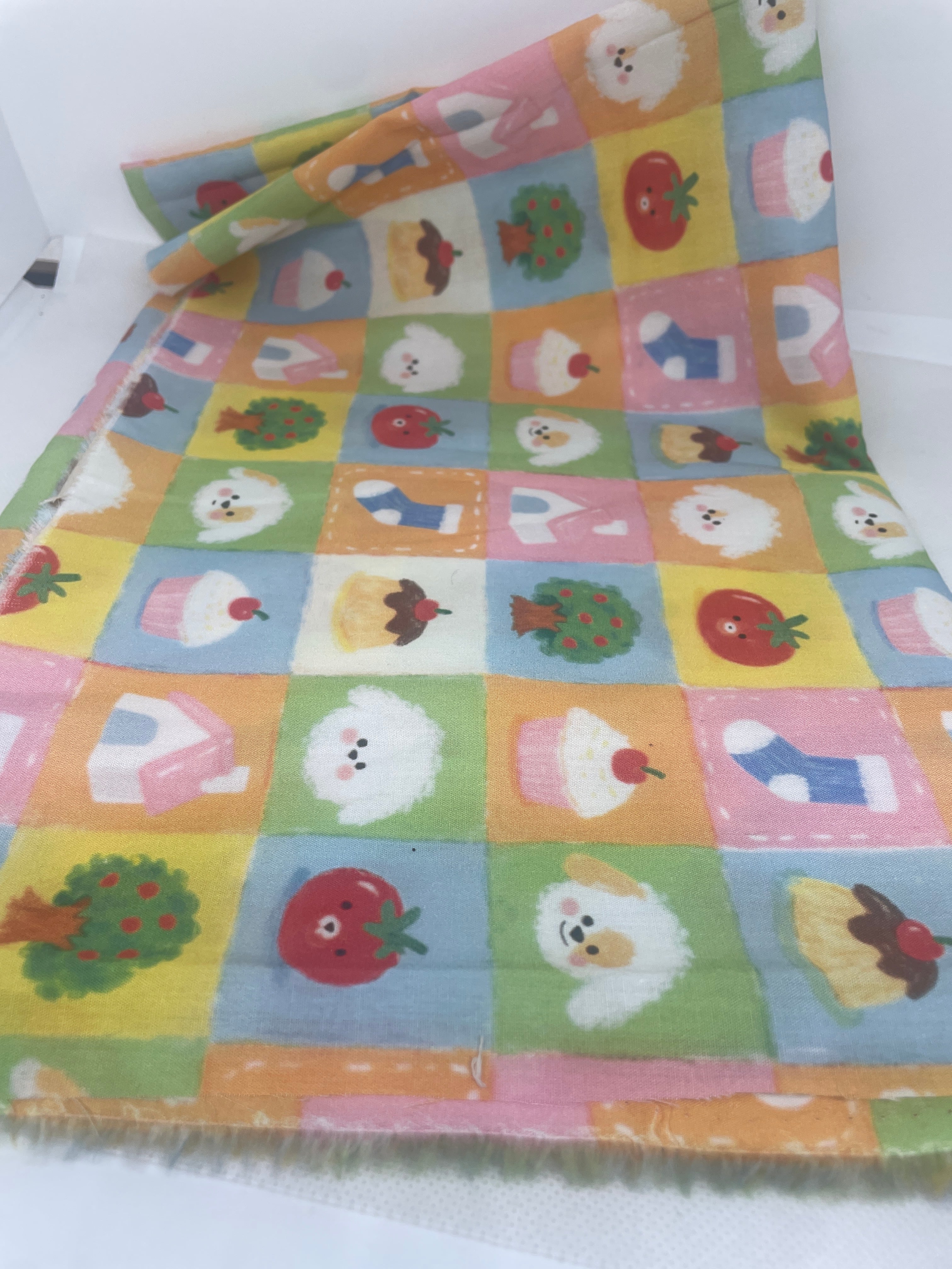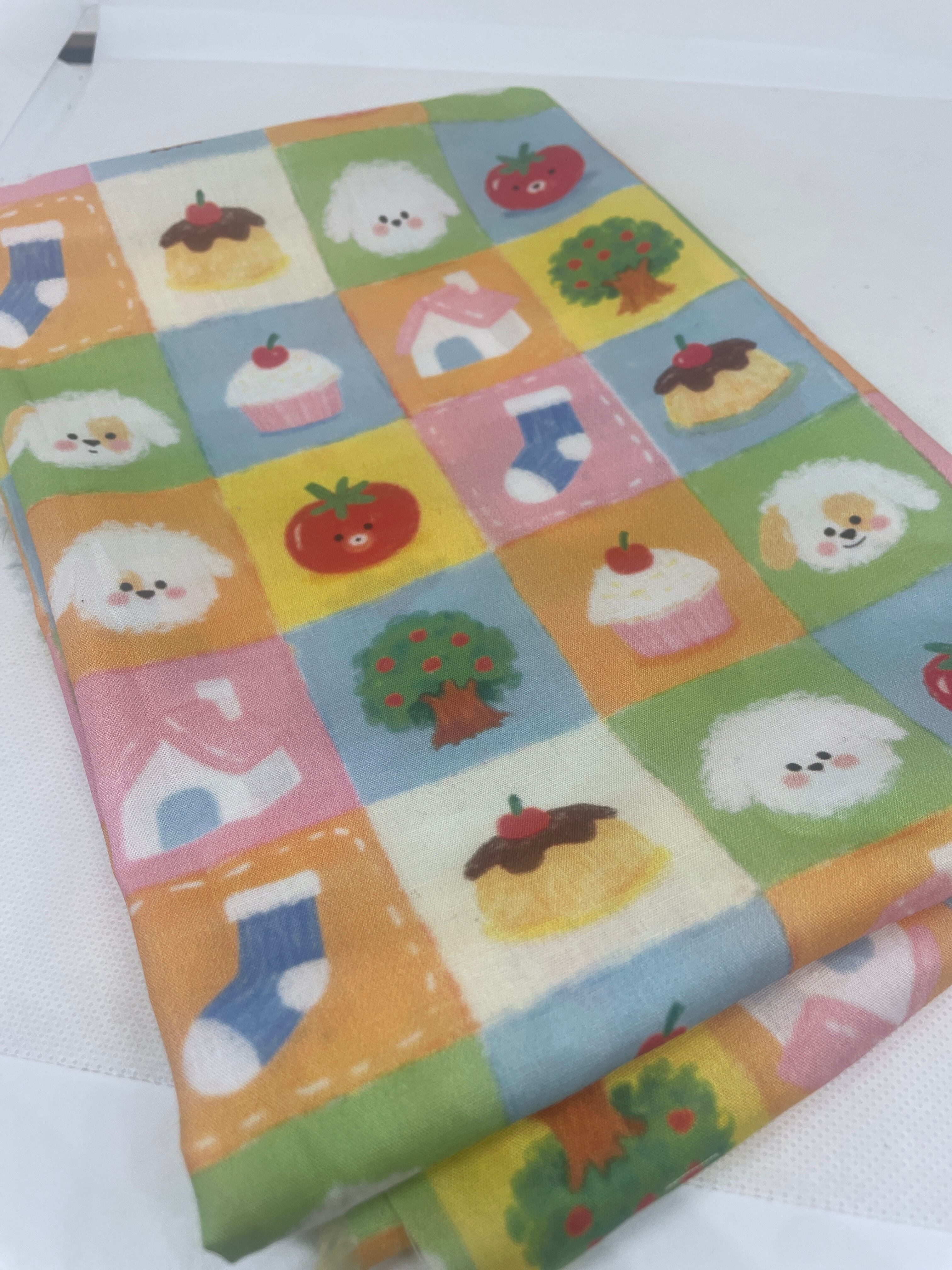 見ているだけでほっこりする、ビションフリーゼ風のわんちゃんやスイーツ、フルーツが描かれた可愛いコットン生地です。
