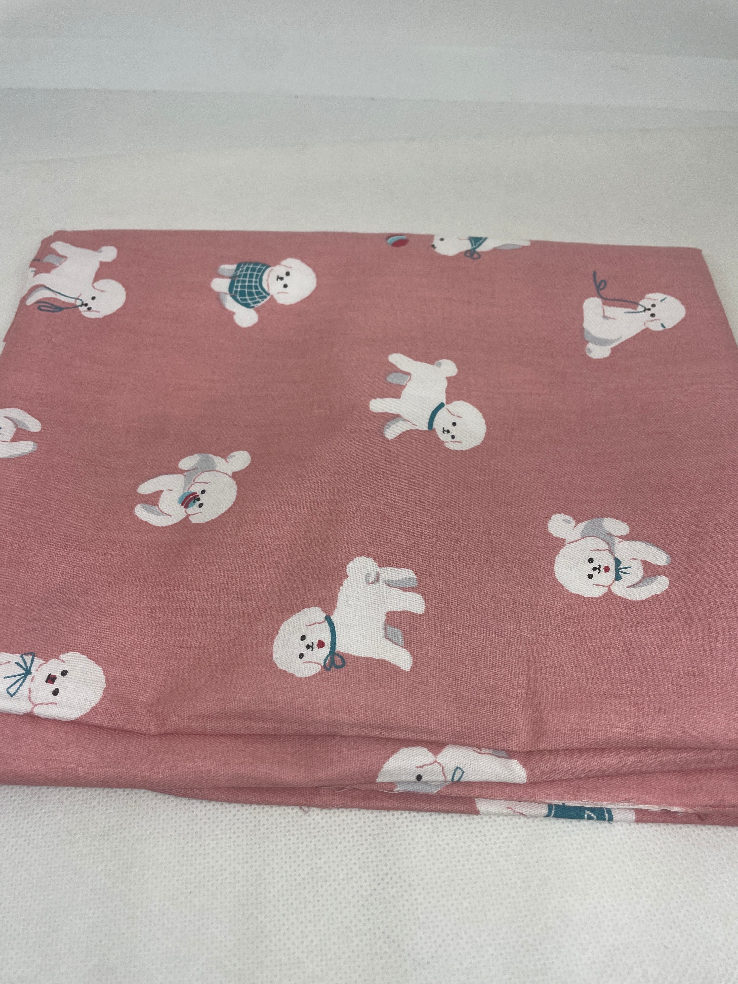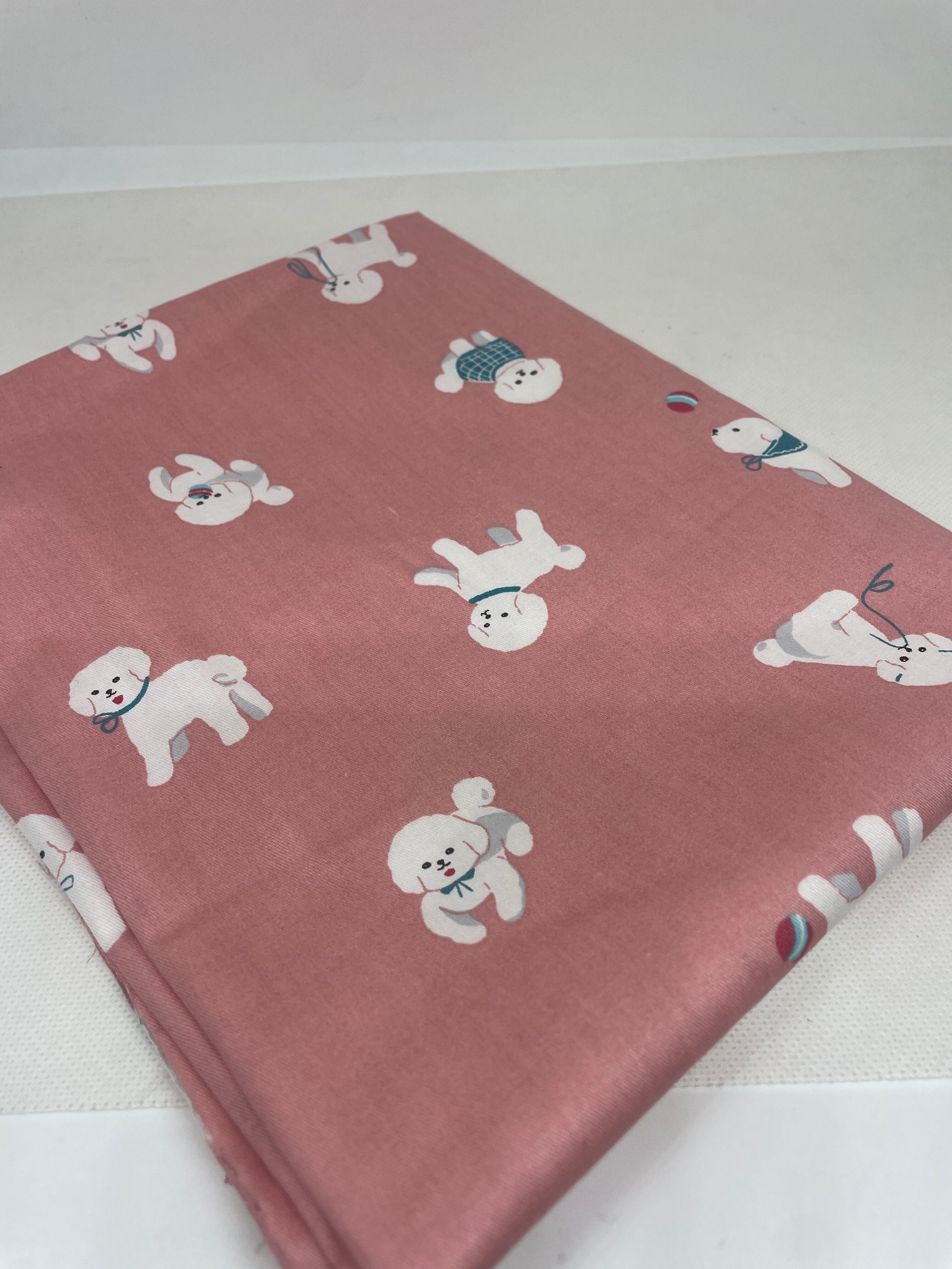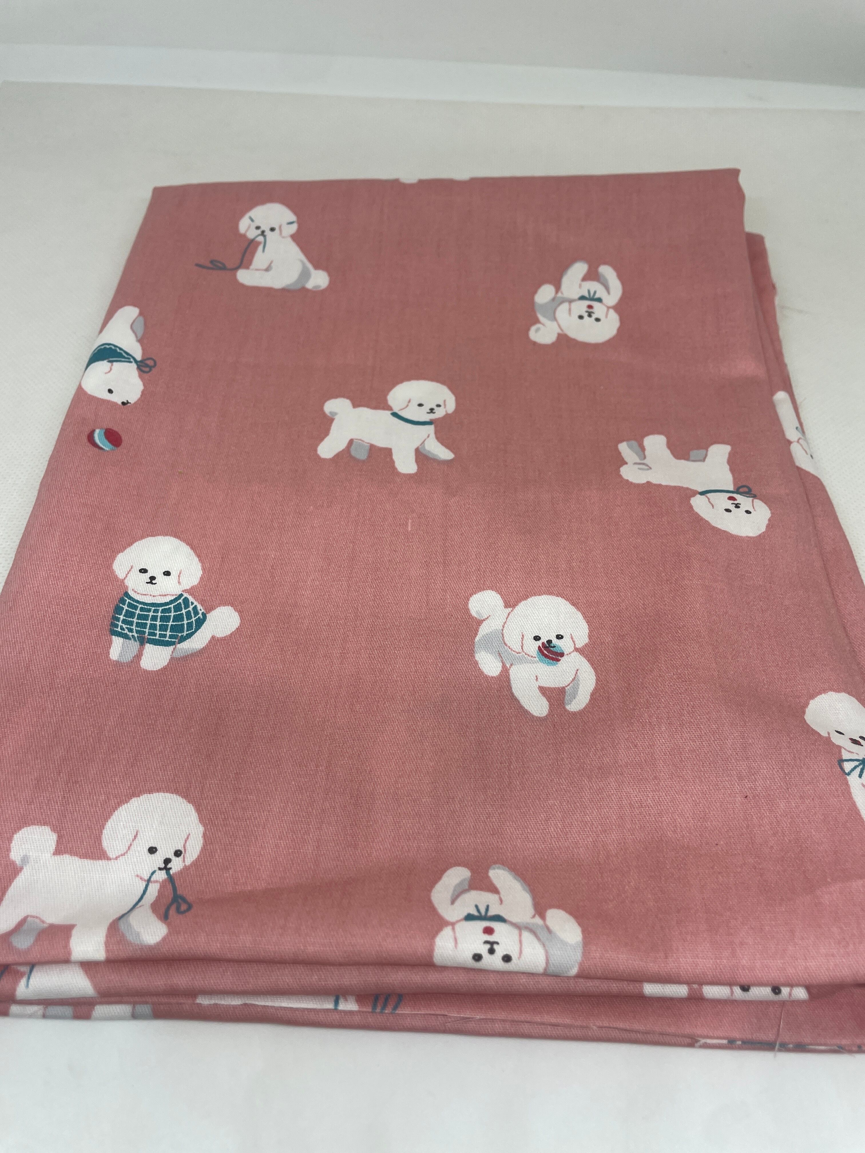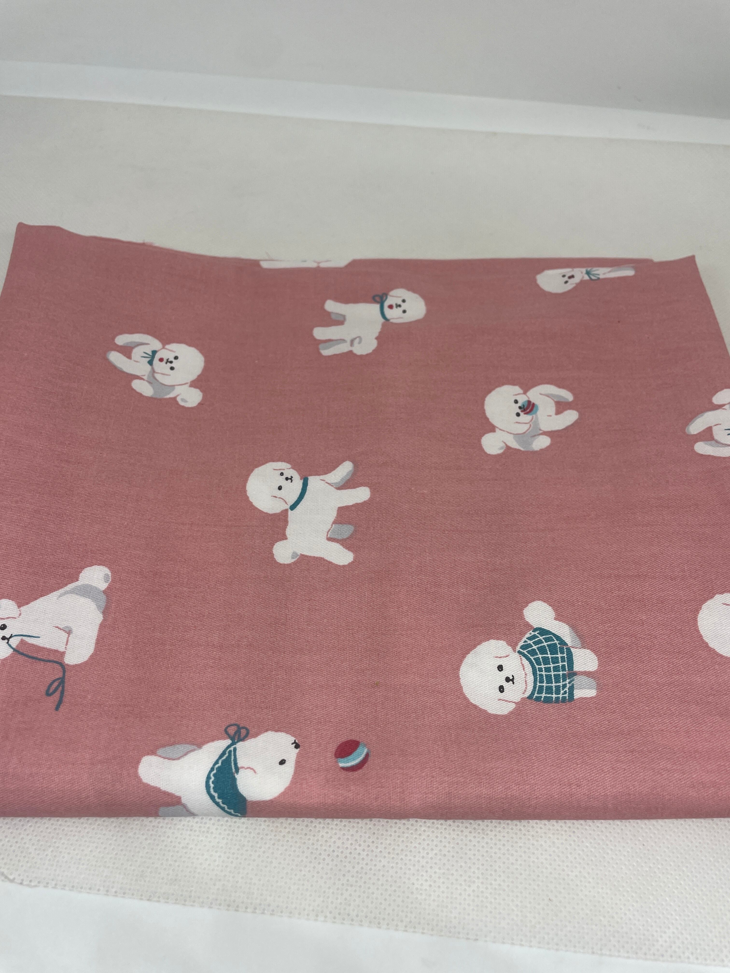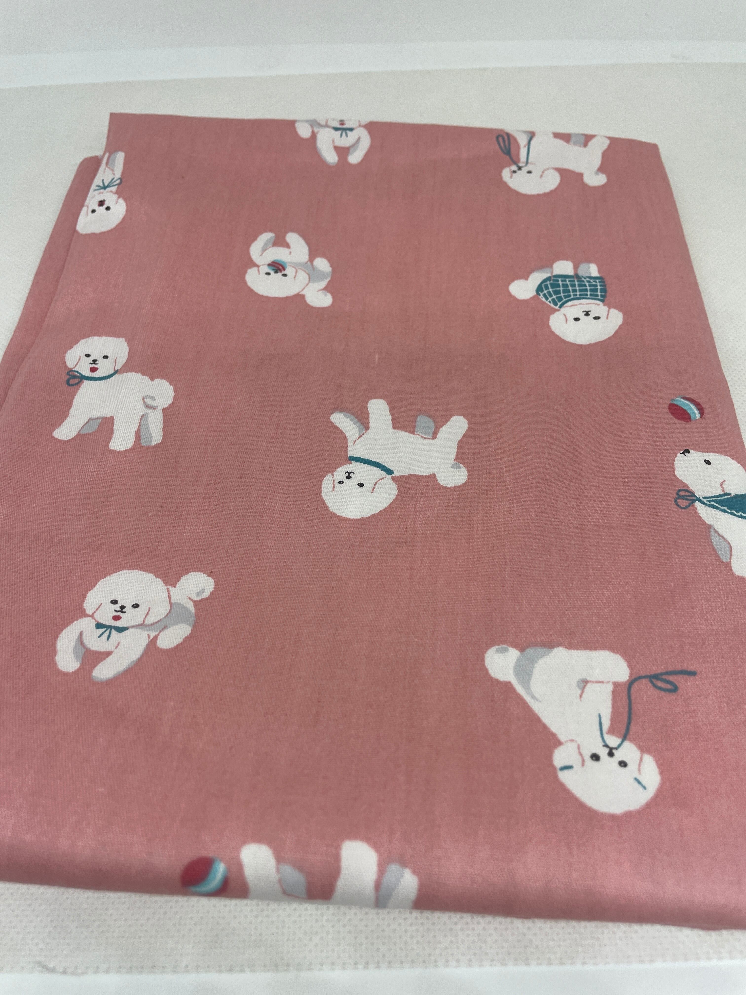 やさしいピンク地に、いろいろなポーズの白いワンちゃんが描かれたデザインで、見ているだけで癒されます。