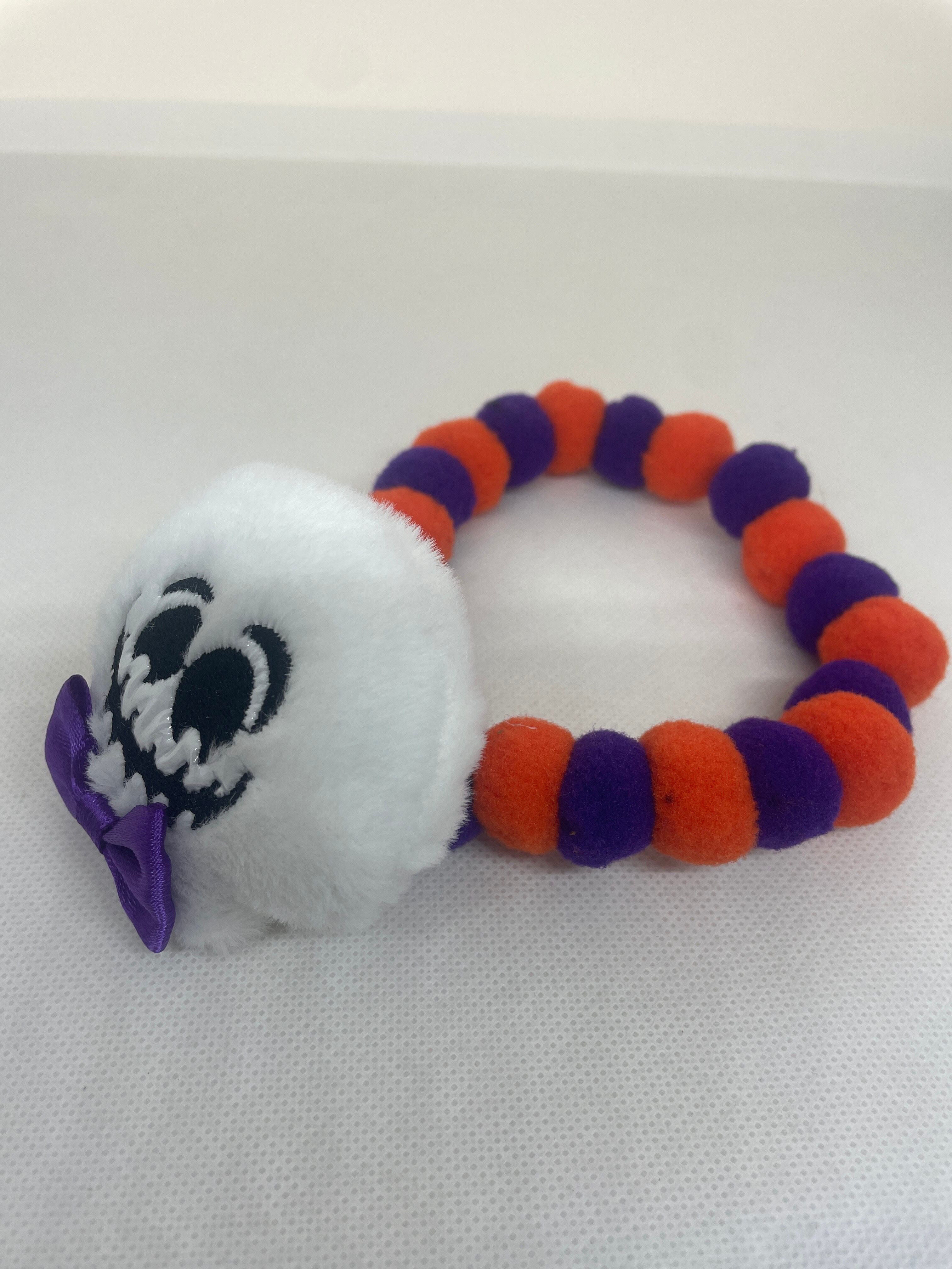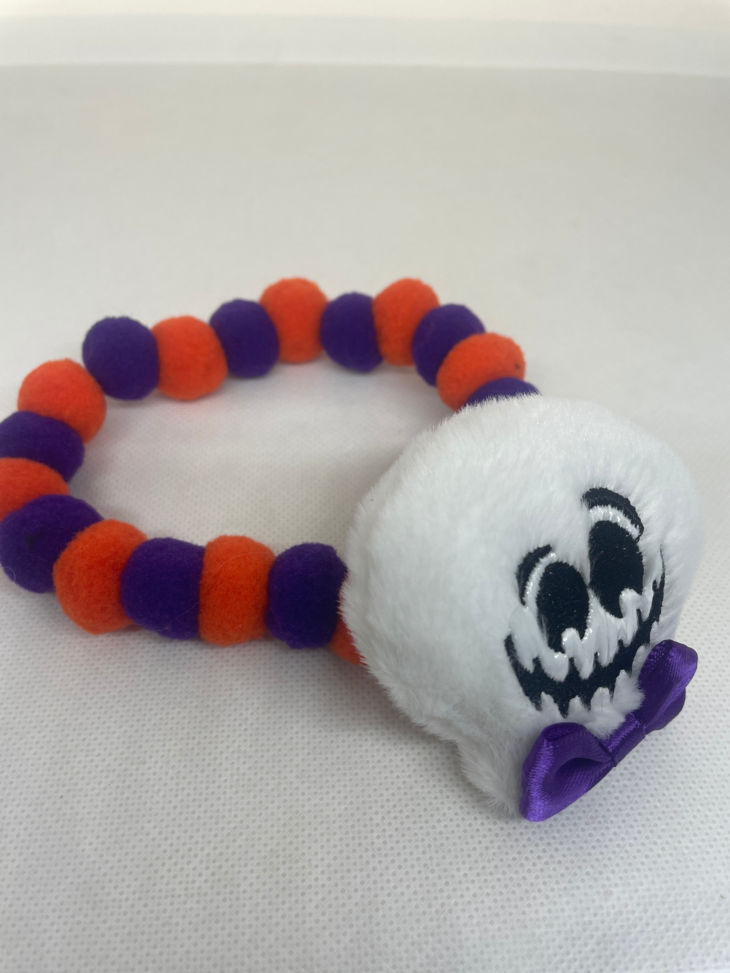 ハロウィンにぴったりの、もこもこ素材がかわいいガイコツの首飾りです。