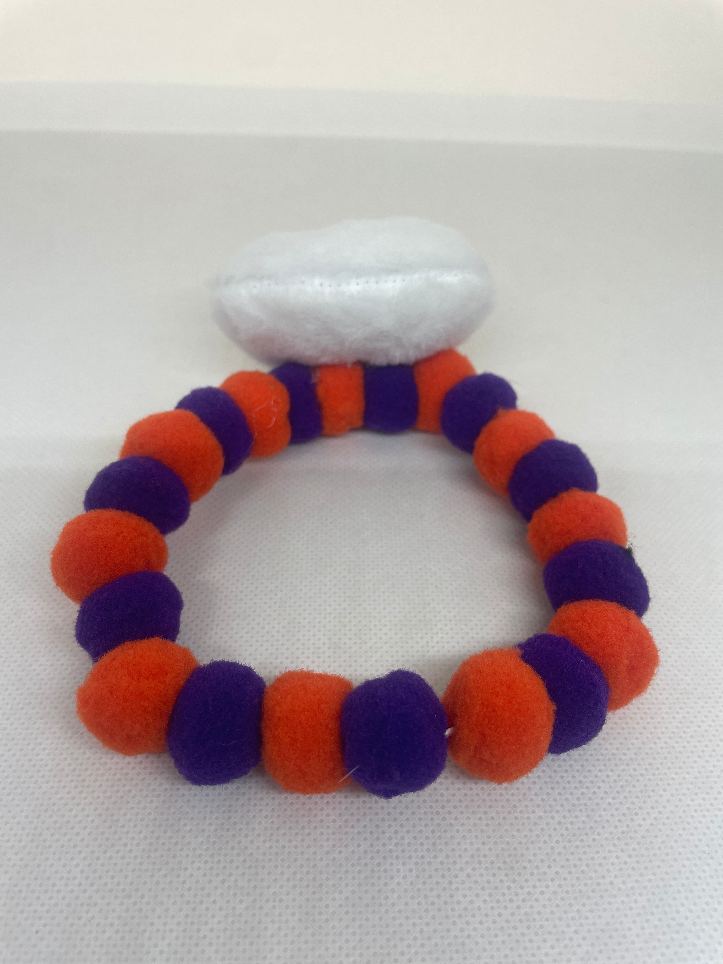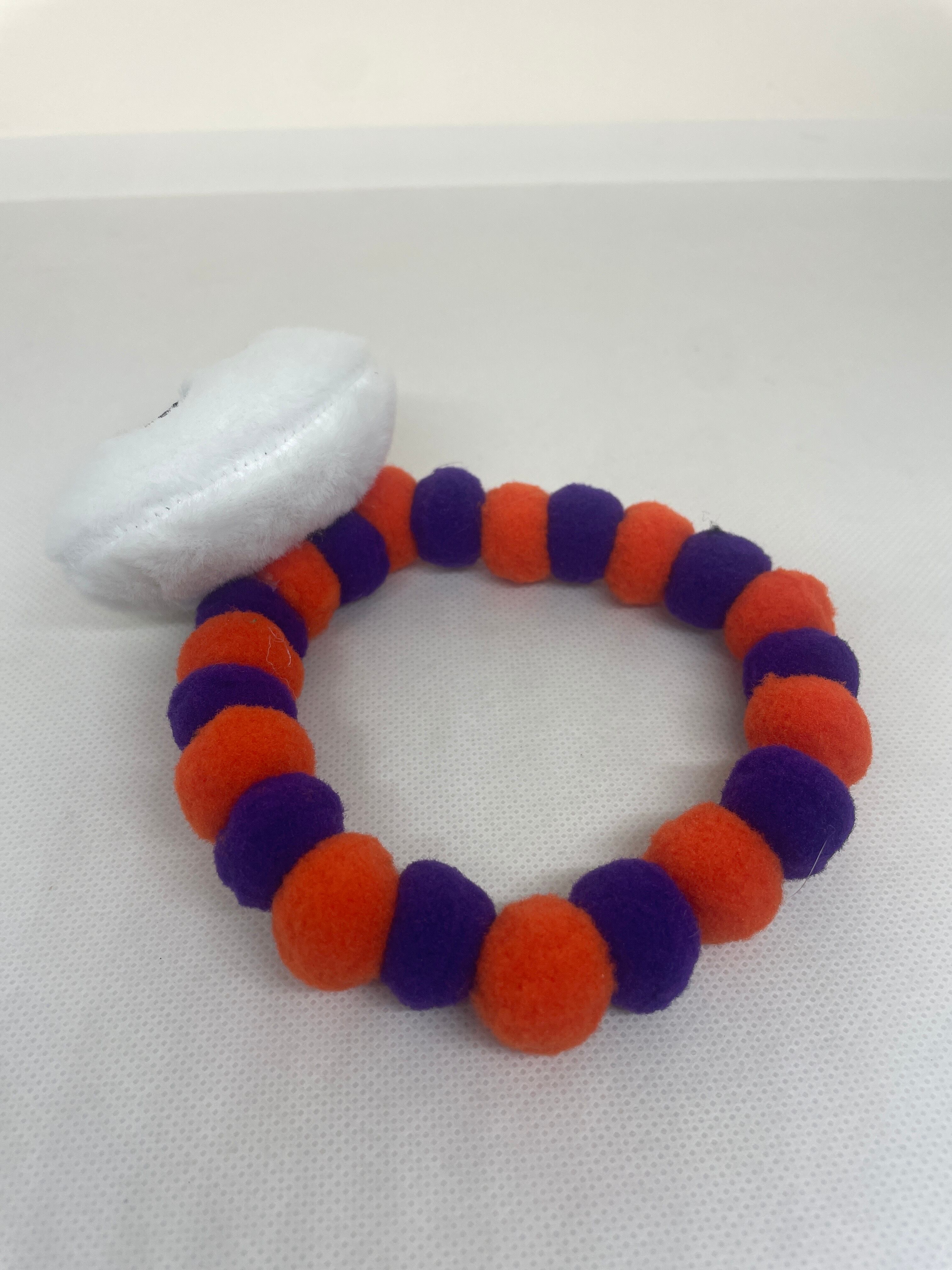 オレンジとパープルのふわふわボールが交互に並び、ポイントにパープルのリボンがついています。