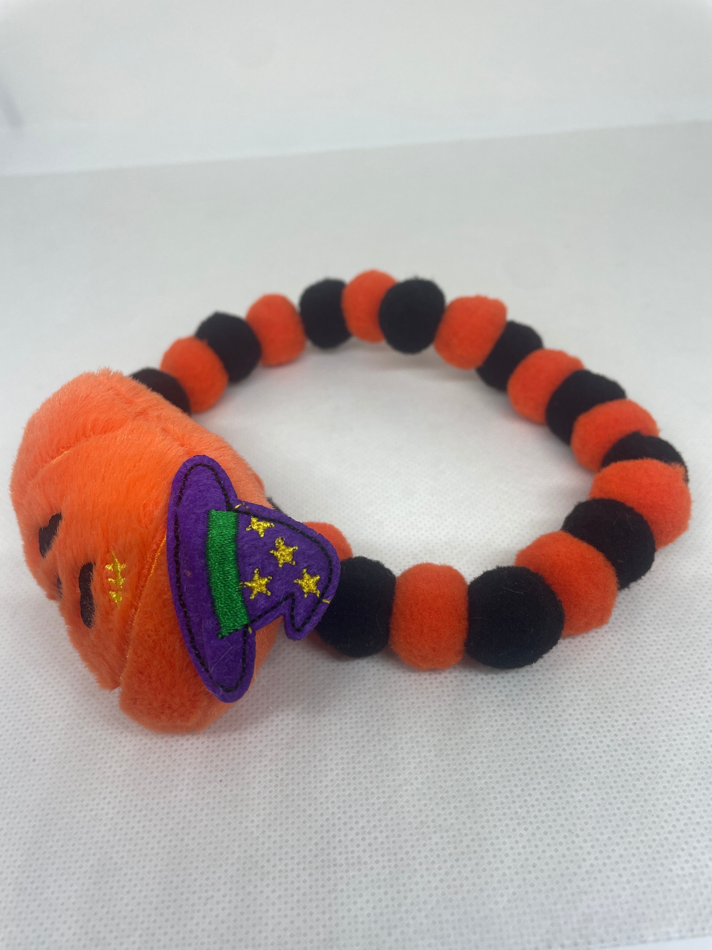 ハロウィンにぴったりの、もこもこ素材がかわいい魔女の帽子を被ったかぼちゃの首飾りです。