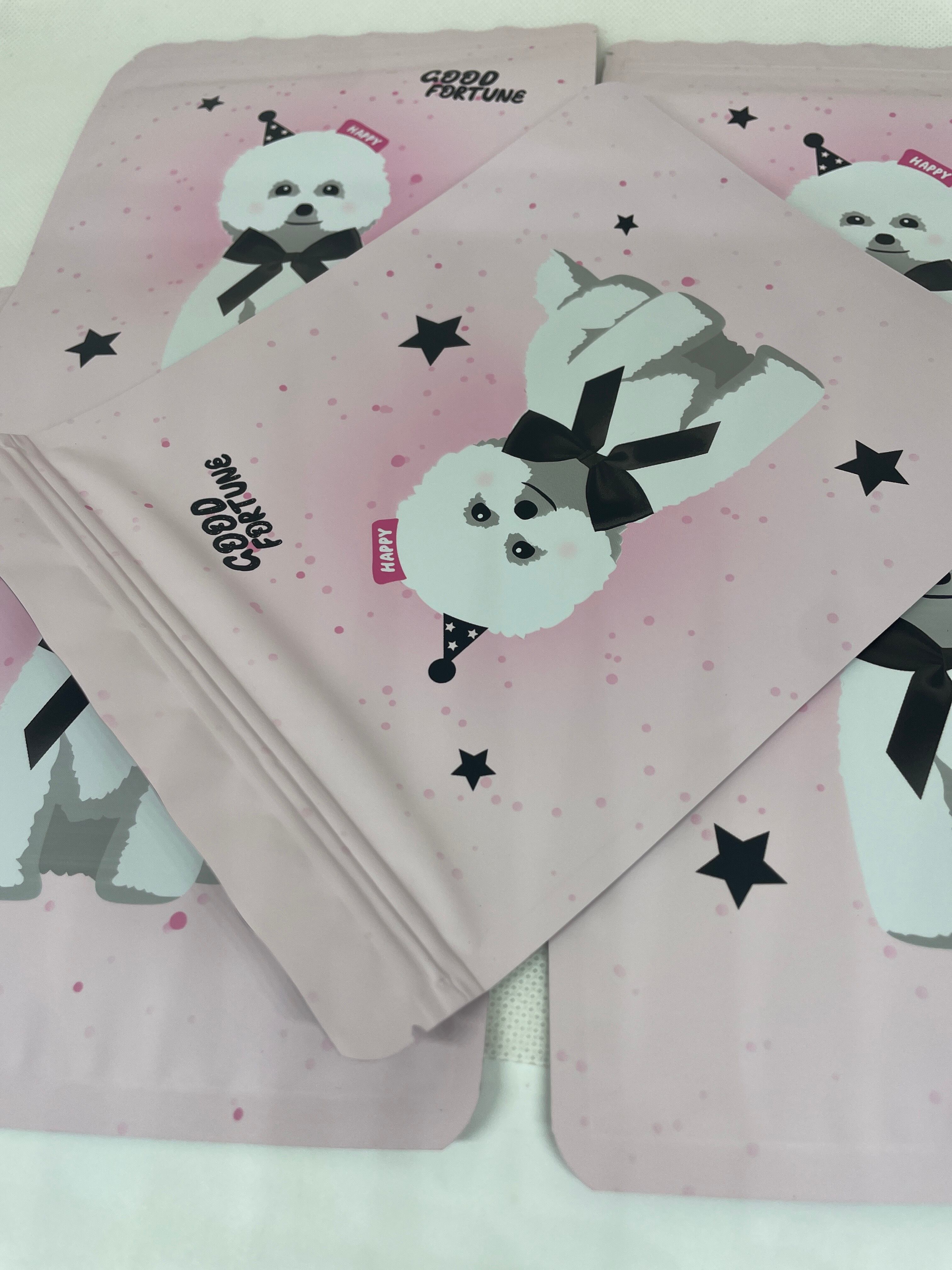 ビションフリーゼのような白い小犬がデザインされており、パーティーハットと黒いリボンがポイント