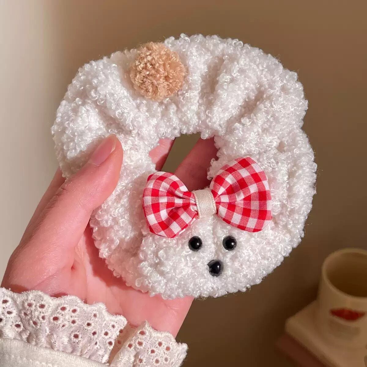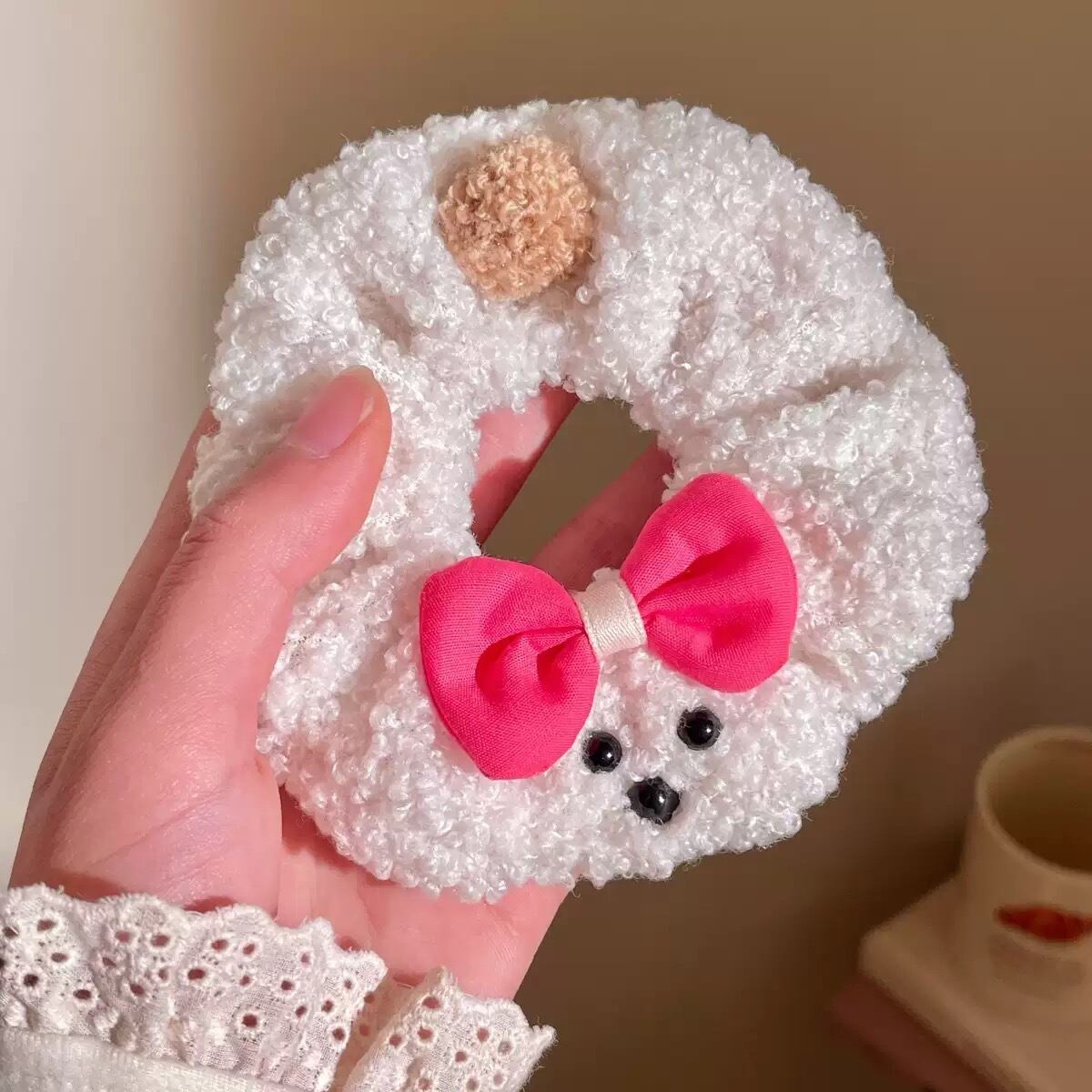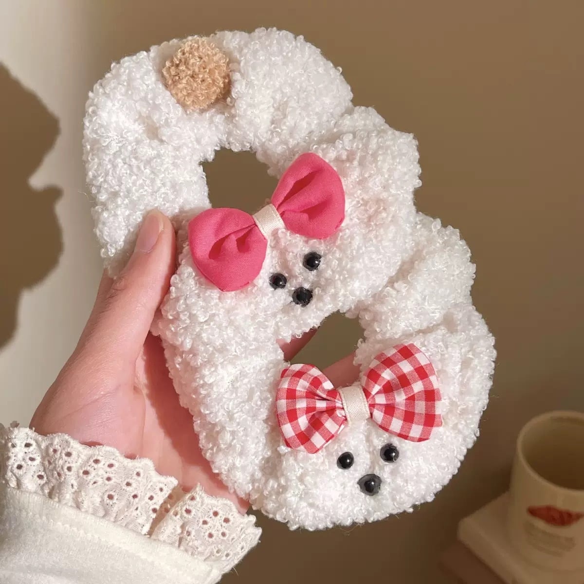 もこもこ素材が可愛い、犬モチーフのシュシュです。