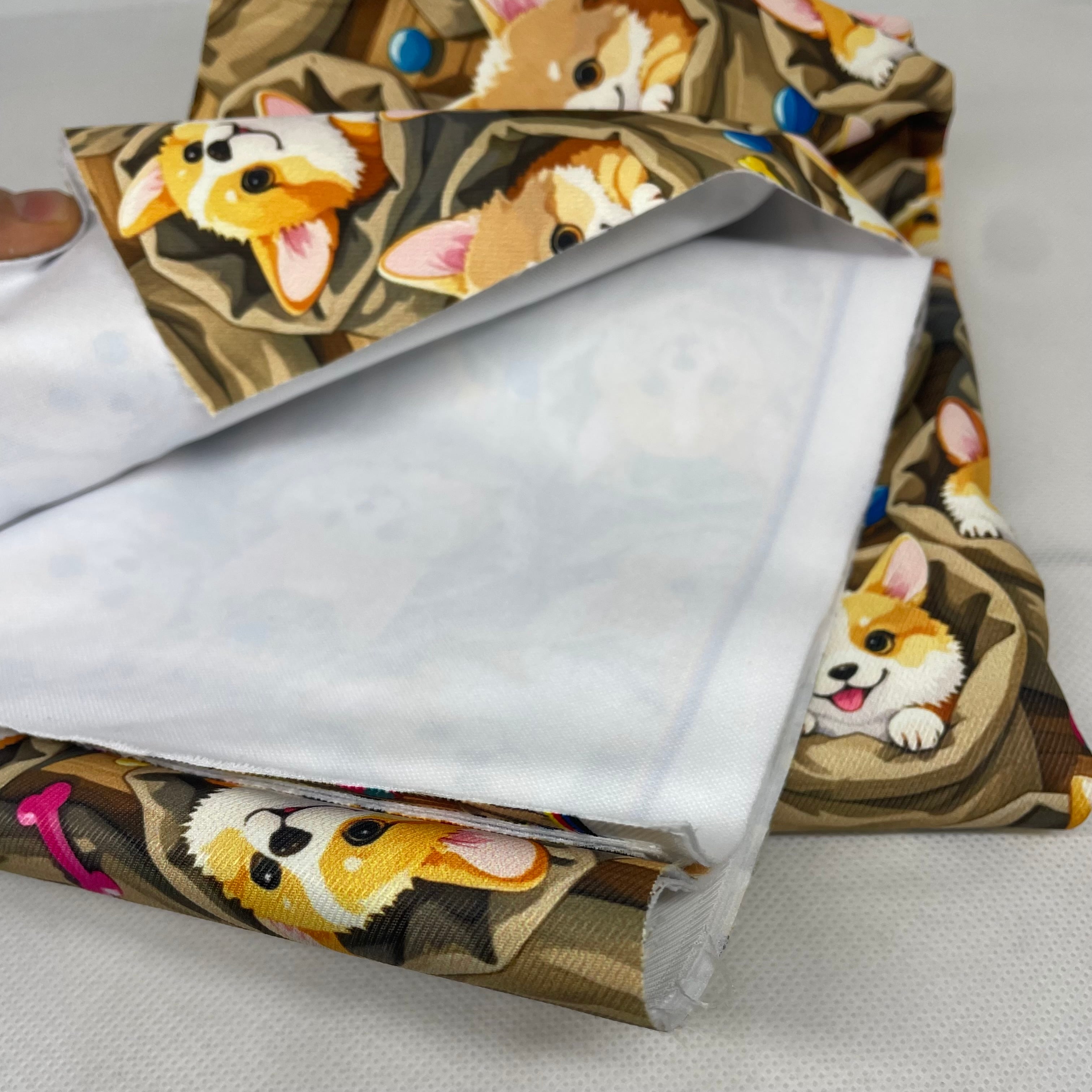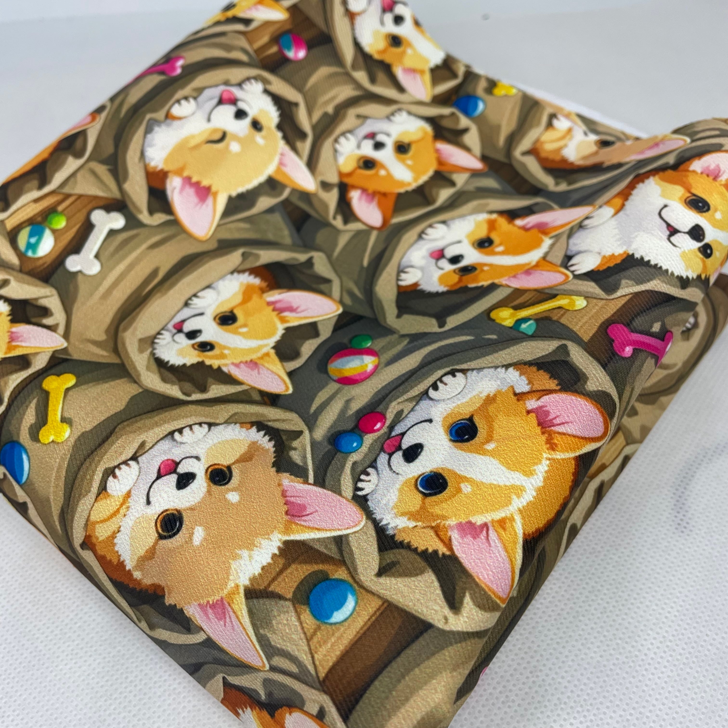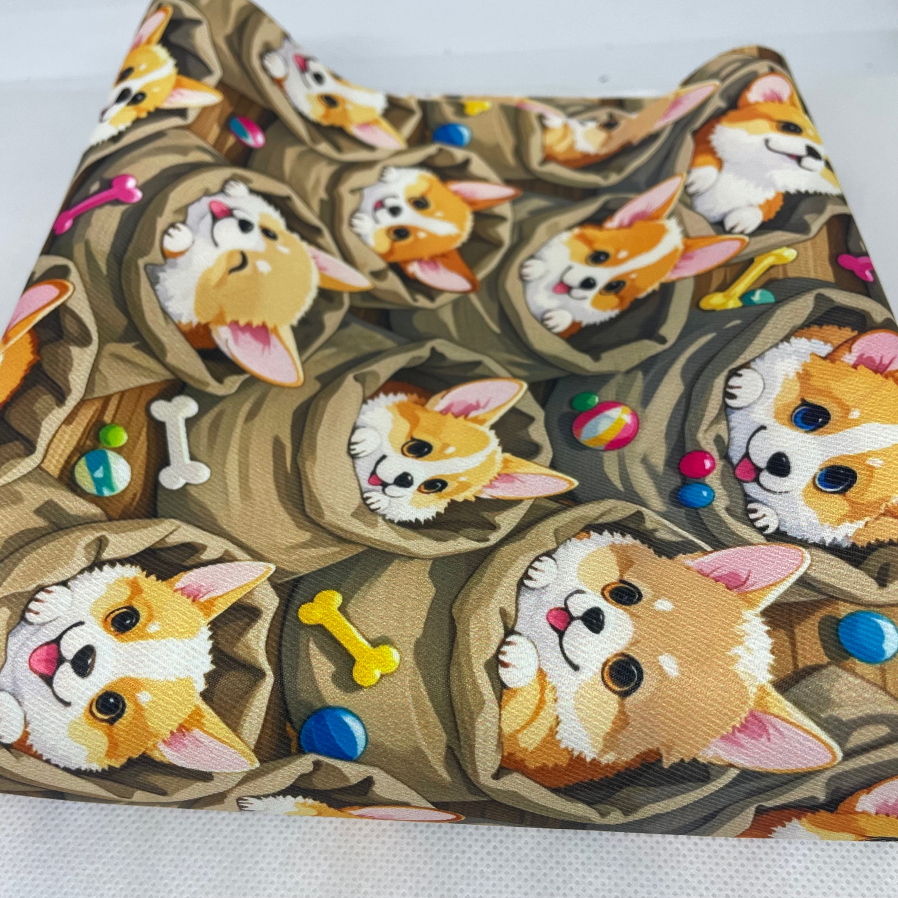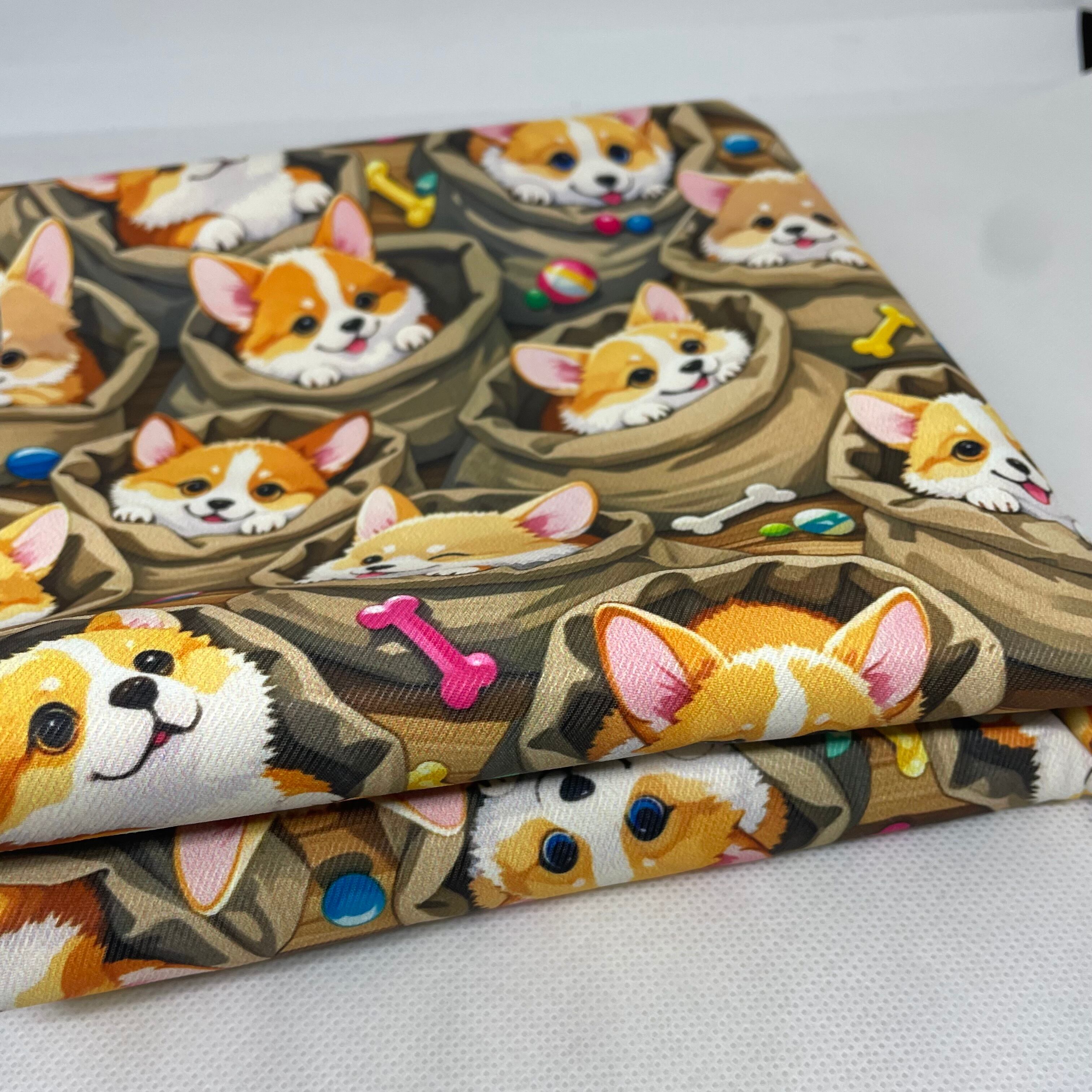 袋の中からひょっこり顔を出すコーギーたちが全面にプリントされた、とってもキュートなポリエステル生地です。