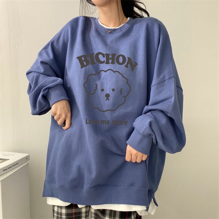 ビションフリーゼ パーカー 韓国ファッション トップス スウェット 長袖 ラウンドネック ルーズフィット ラフ カジュアル お出かけ 着回し 配色 アニマル イラスト プリント 犬 ドッグ 秋 冬