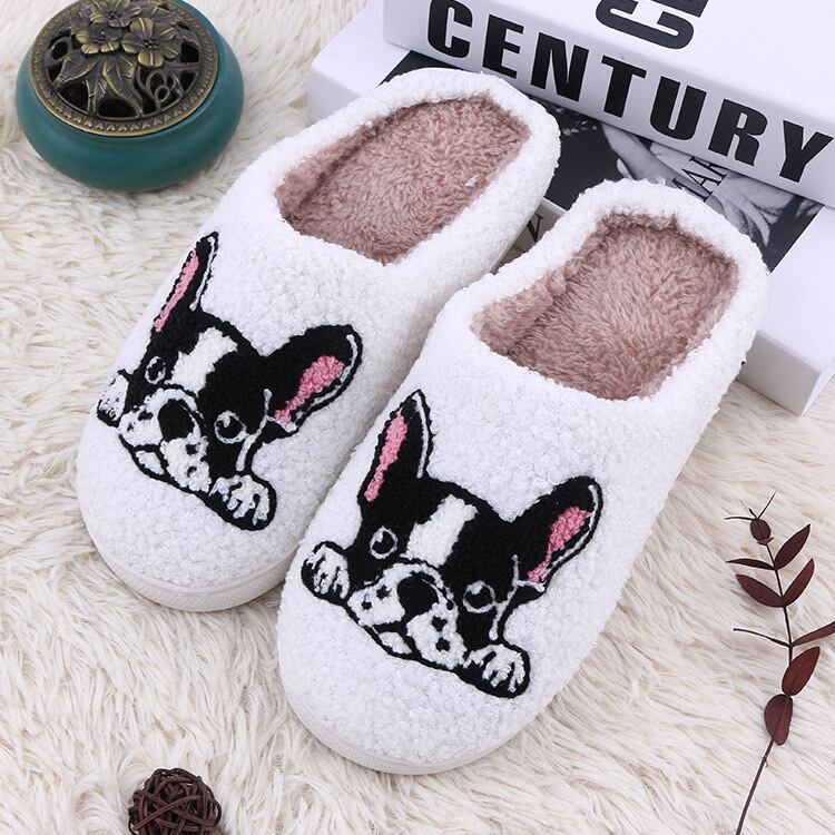 フレンチブルドッグがかわいいもこもこルームシューズ。